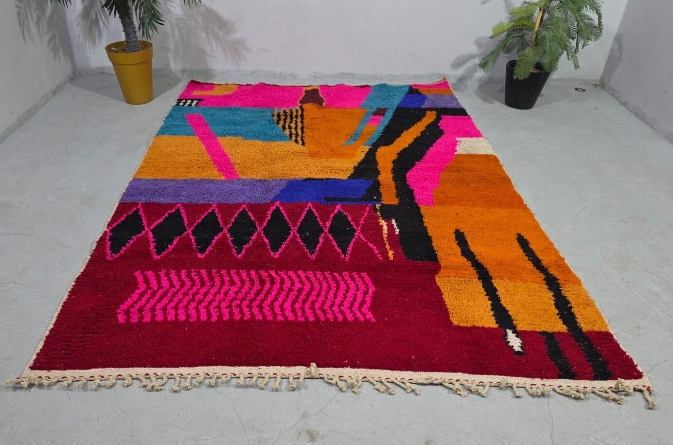 In addition to religious influences, the design of the Boujad Moroccan rug is distinguished by a very modern artistic approach. The color combinations found in Boujad carpets, in addition to the use of natural or chemical colors, reveal a kind of absolute chaotic order.